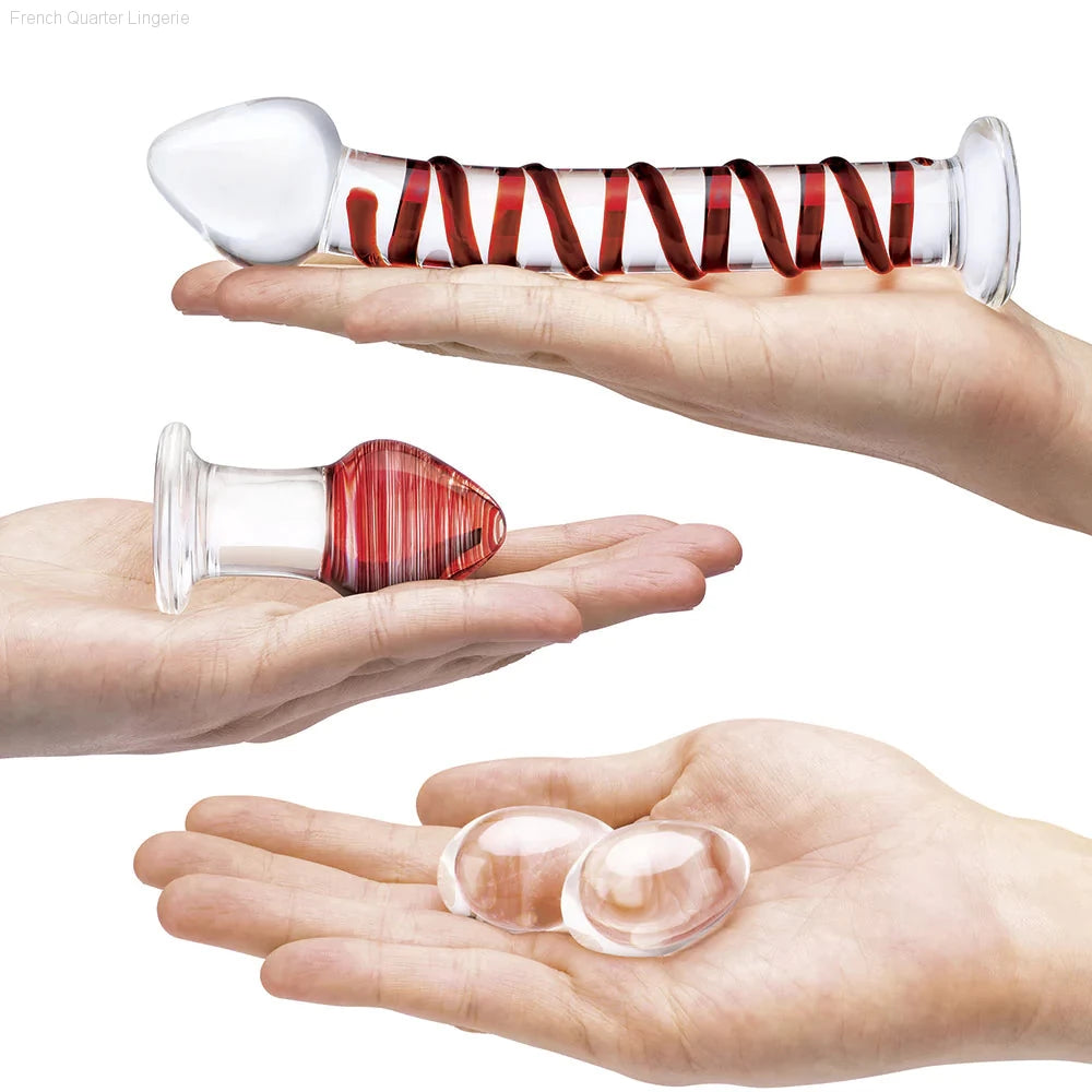 Twist and tantalize with our 4 Piece Mr. Swirly Set with Glass Kegel Balls and 3.25" Butt Plug set from Gläs. Spiral into a euphoria of double penetration with two textured, bulbous plugs designed to hit the P-spot and G-spot simultaneously. Use both together for vaginal D-P play, or interchange them anally for a backdoor bonanza of indulgence. Or train up your pelvic floor while taking it up the backdoor by coupling the glass kegel training balls with the butt plug for a exercise in ecstasy.