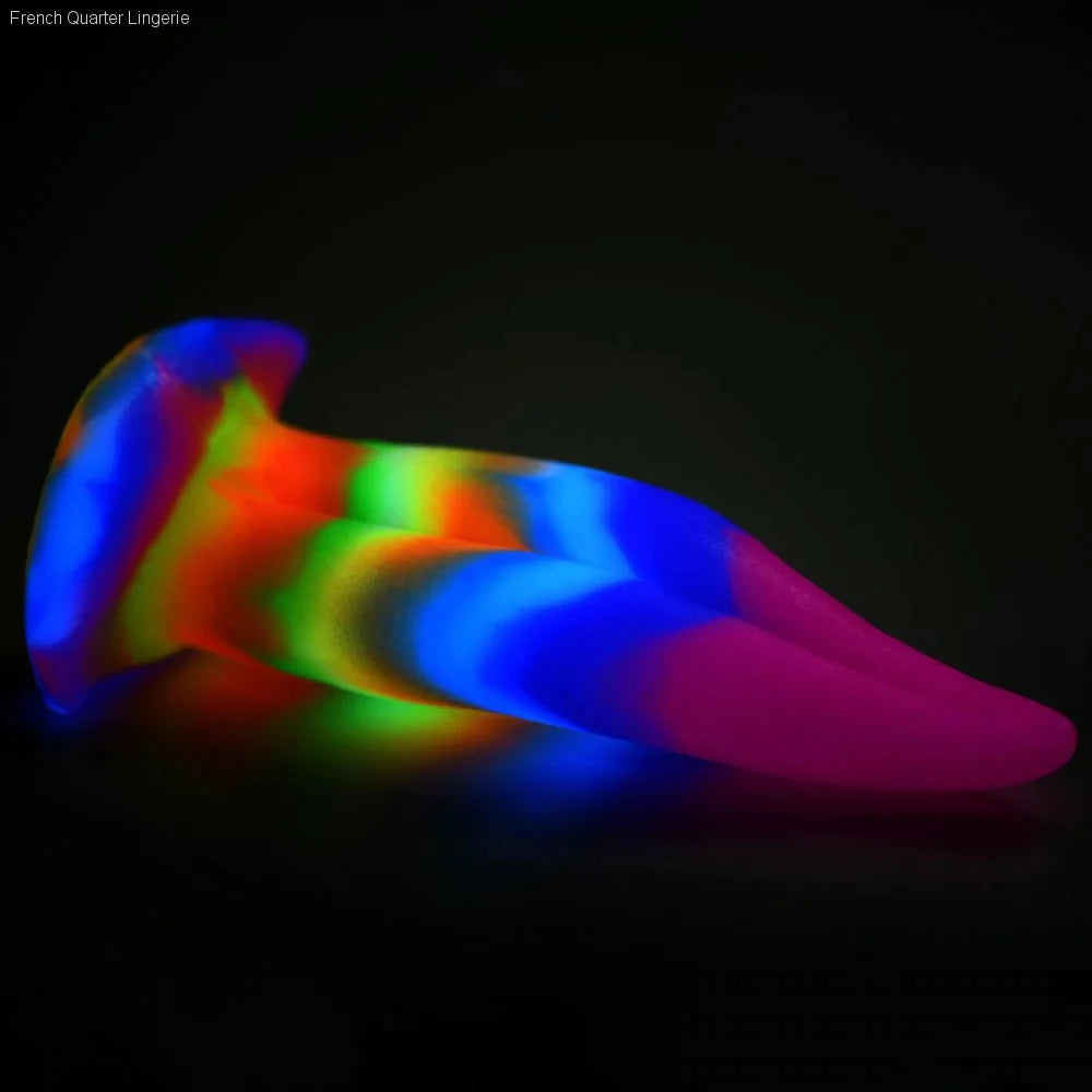 Add to the novelty of delicious sights and sensations with this vibrantly colored, glow-in-the-dark, unicorn tongue dildo! The tongue is sinuously curved with a tapered tip that slips right into your holes for deep and unique pleasure. With 7 inches of insertable length and a little over 2 inches in diameter at the widest point, it's a substantial dildo to take in! Made out of premium, phthalate-free silicone, this silky-smooth dildo is firm, flexible and perfect for both you and your partner to enjoy! Enjoy hands-free with the strong, suction cup base that can be placed on any flat surface. Invite your partner to play as you combine this magical tongue with a compatible strapon harness for fantasy roleplay. Enhance a costume or kinky cosplay with this unique and sexy tongue! Use only with water-based lubricants for best results and wash with warm water and mild soap after each use. Let air dry and spray with a toy cleaner to keep it clean.