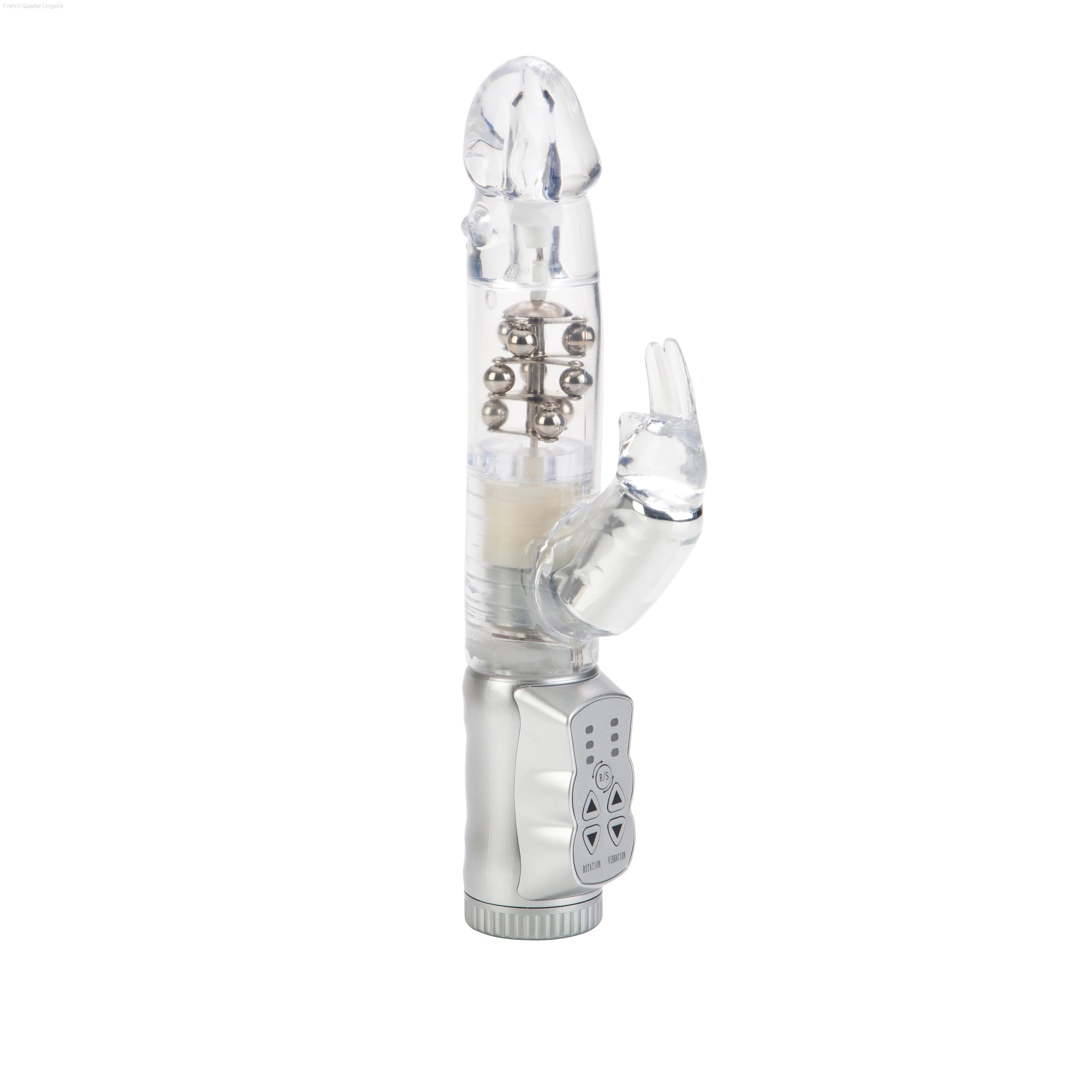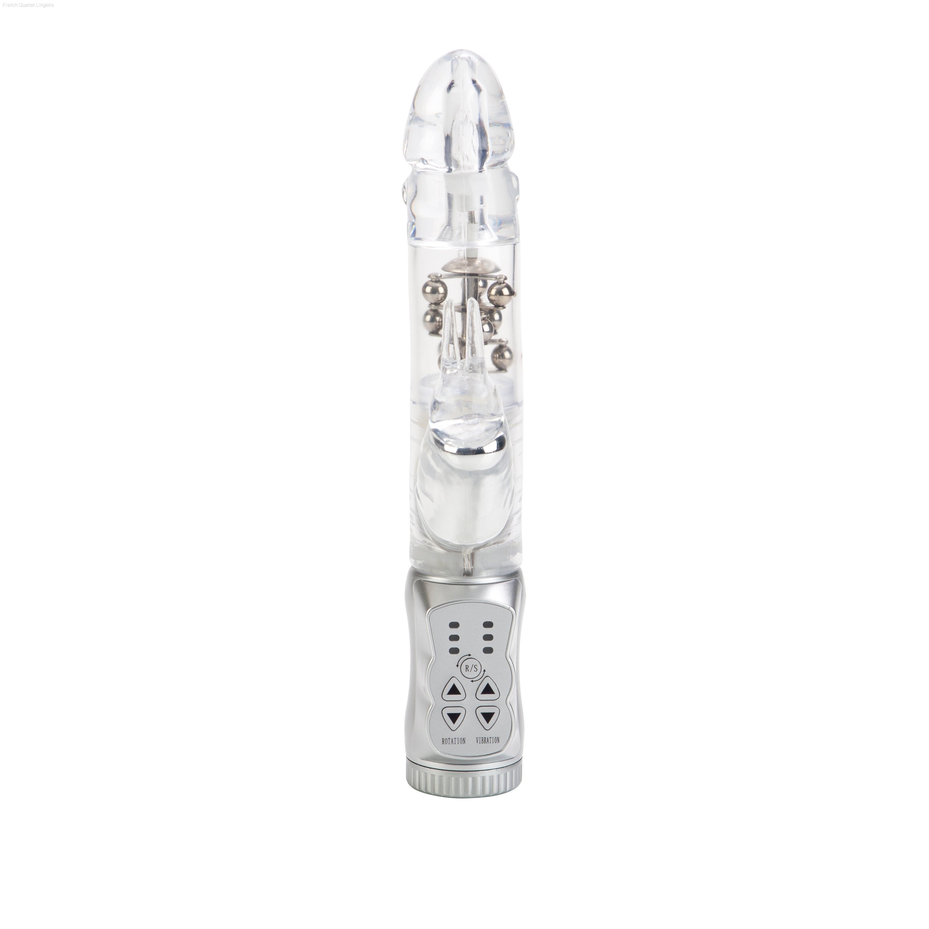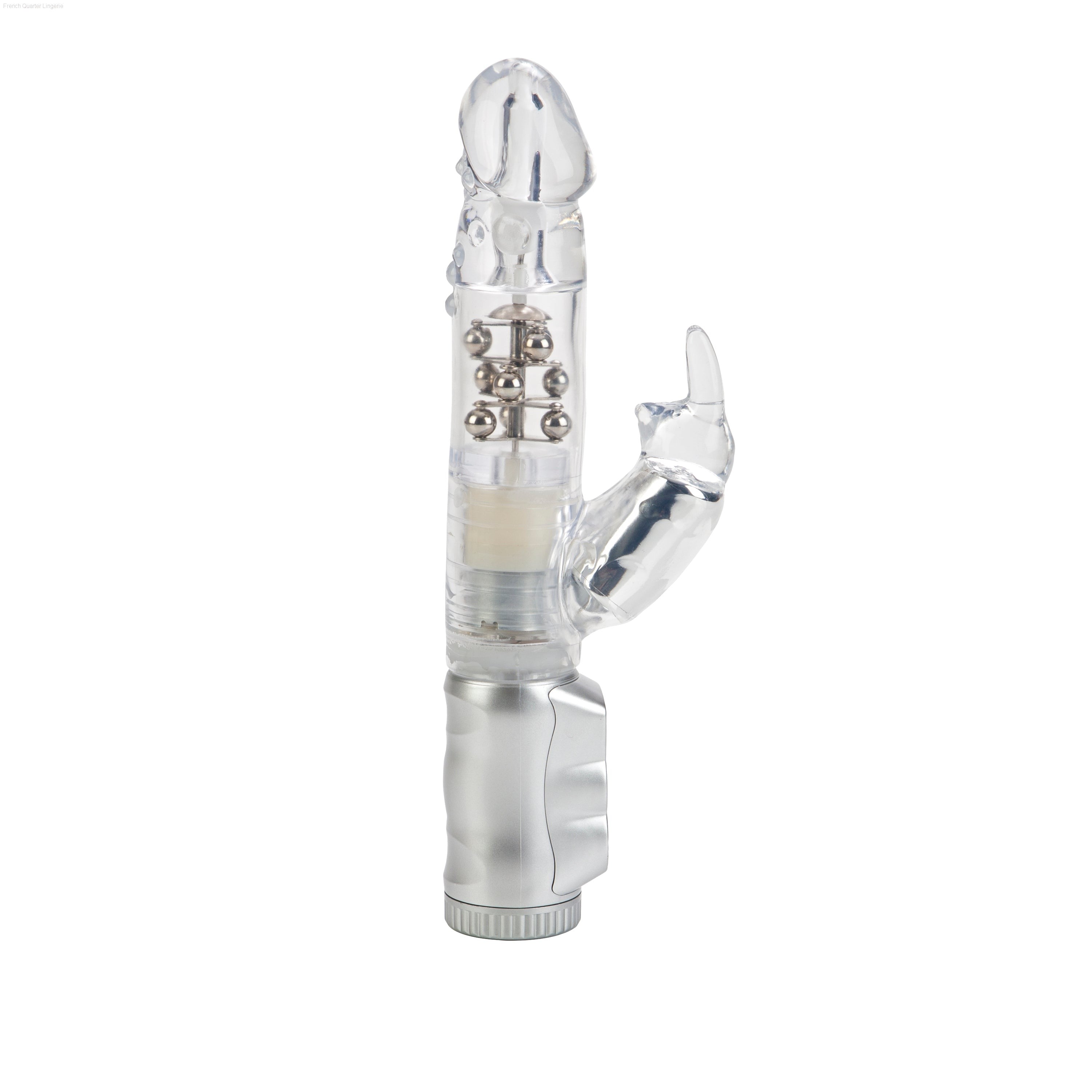 Made from smooth, pliable phthalate free PVC, the discreet massager measures 4.75" x 1.5"/12cm x 3.75cm. The vibe has a transparent jelly shaft, with floating metal beads rotation, and a super soft, curvy bunny shaped clitoral teaser, with flickering ears for intense stimulation. To maximize the pleasure, the easy to use massager boasts 3 vibration speeds and 3 speeds of reversible shaft rotation. To intensify the sensations, it is recommended that you use a quality lube.