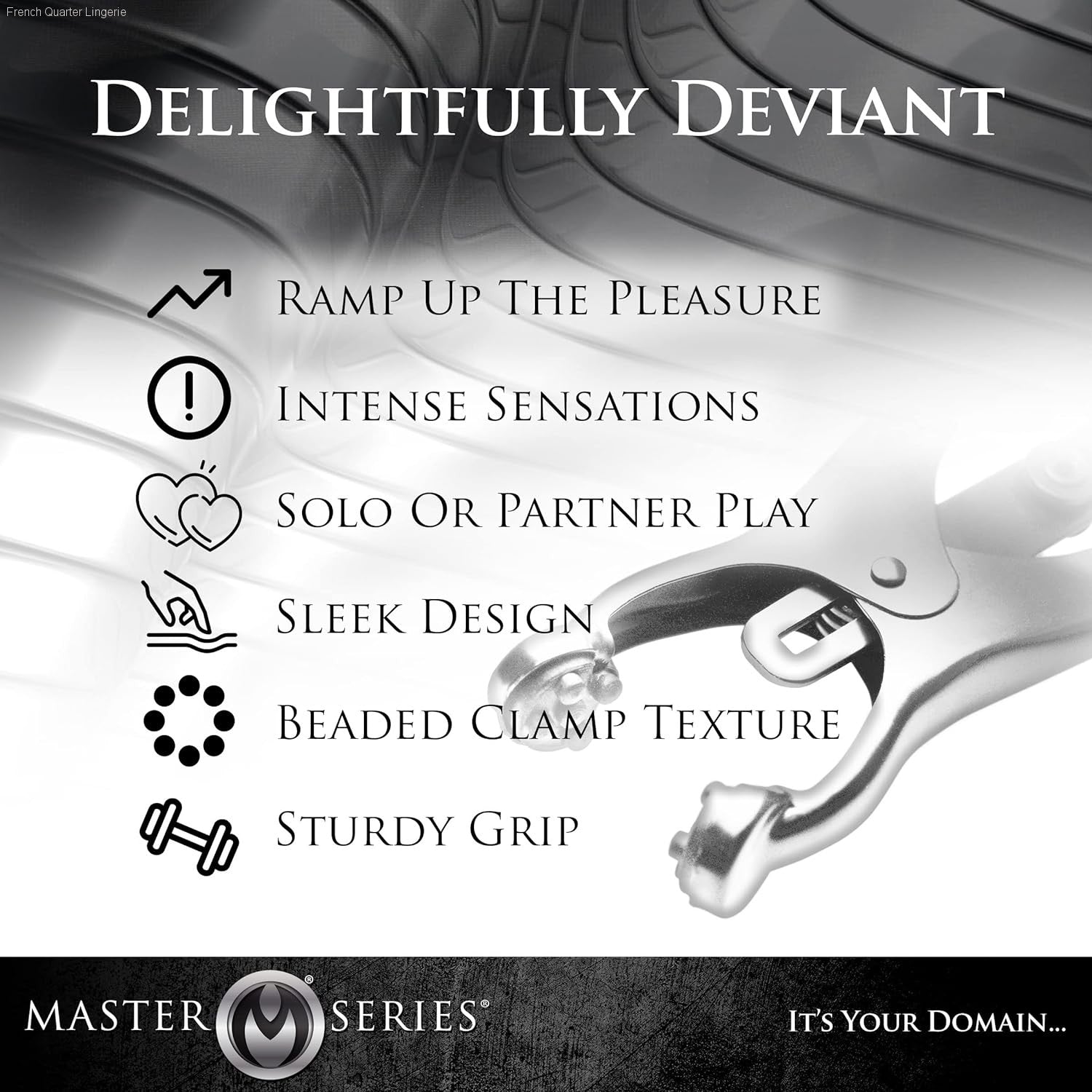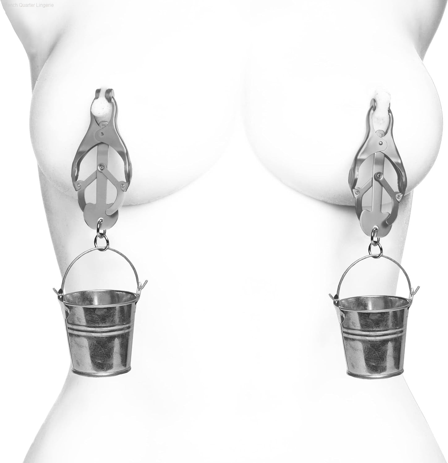Put your submissive or slave through a unique torment with a set of nipple clamps that allow you to add weight in an unusual way! In the style of butterfly clamps, or clover clamps, these attractive pincers get tighter as they are pulled. Rubber tips ensure that all pain is in the form of pleasure and that they maintain their grip. To add weight, simply fill the small, hanging buckets with water, lube, sand, stones, or whatever your devious mind can come up with. You will love watching your plaything carry the buckets around by their tits!