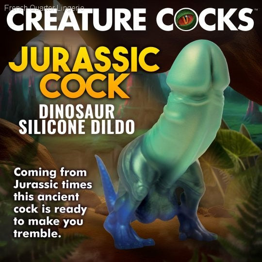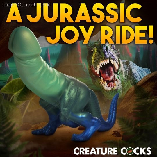 Want to bring some novelty into your life? This dinosaur dino dong stands erect all by itself and makes for an entertaining desk decoration as well as a fun, personal plaything! The green and blue, premium silicone toy is phthalate-free, body-safe, and built for a smooth ride! The long tail keeps it balanced along with the large dino legs. Between the legs hangs a pair of balls. To counterbalance the tail, the shaft is long and curved with a realistic-looking dong and head. Have fun with this dino! Place it on your desk or shelf, give it a name, hide it among other dinosaur toys, and let it blend into the herd! Or use it as a sexy toy, too! The shaft is firm and flexible so you can enjoy riding it as you grab onto the tail and legs! This dino creature is designed as an entertaining decoration that you can keep or give as a gag gift, and also as a personal pleasure toy, too! Use only with water-based lubricants. Wash with warm water and mild soap, then rinse off and spray it with a toy cleaner after each use. Let air dry.