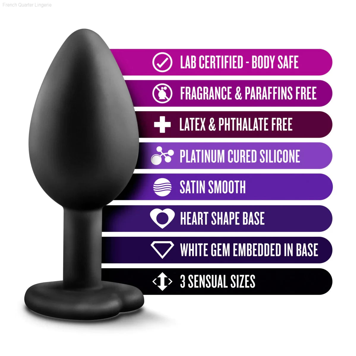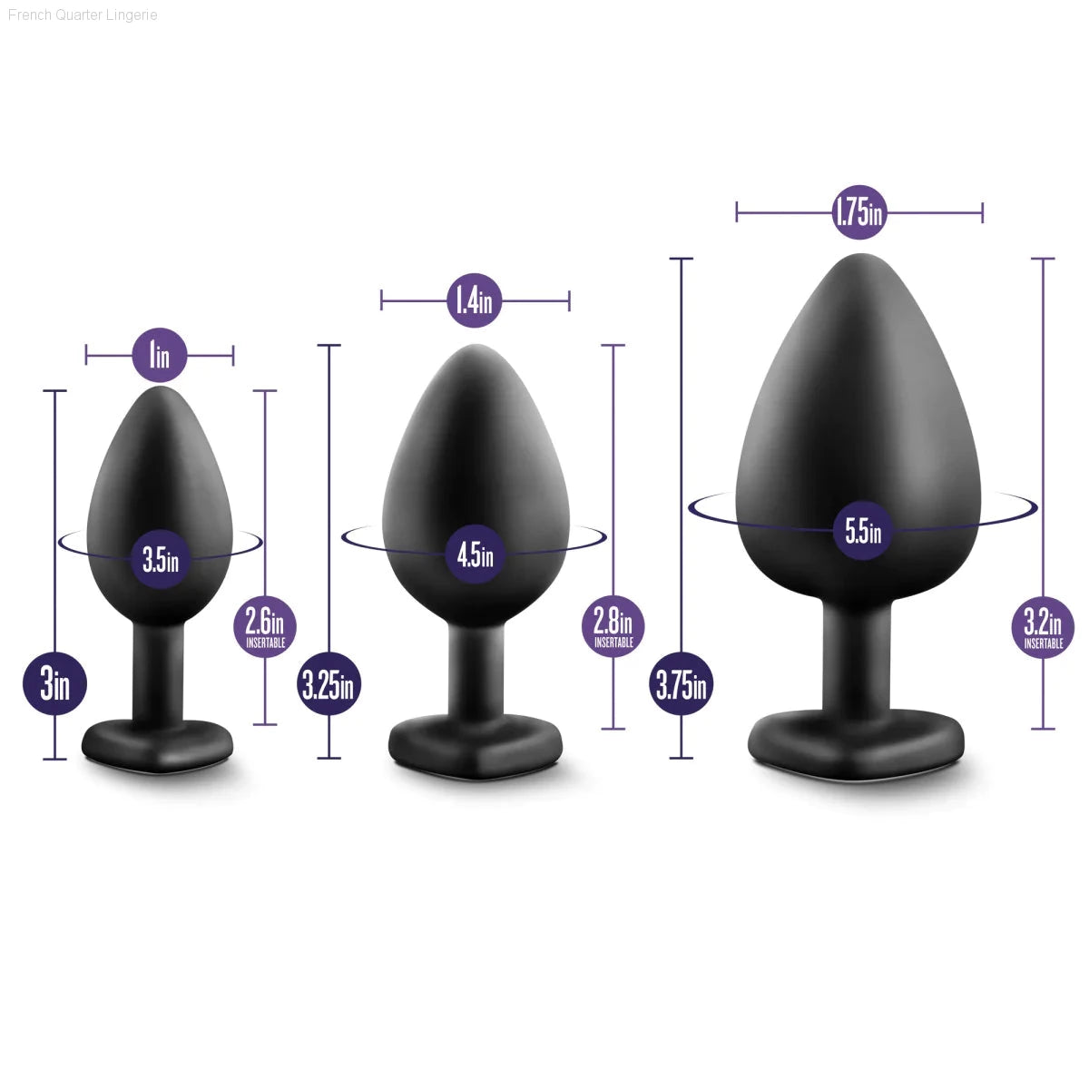 Your anal training play just got pretty with this sweet set of Bling Plugs! Starting with the small size for beginners, you can slowly graduate to the medium size and then to the large size when you are fully comfortable. This kit includes three plugs, ranging in size from small, medium, and large. Each plug features a tapered tip for easy insertion and a tight neck for gentle pressure and extended wear. Use this kit if you and your partner are new to anal play. Or just use it in addition to your regular erotic play. For the best experience, use with your favorite, high quality water-based lubricant. Ultra-silk™ smooth and made with Puria™ silicone.