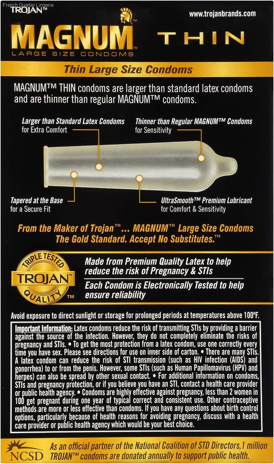 Magnum™ Thin Lubricated Condoms are larger than standard condoms but thinner than regular Magnum™ condoms. These super thin condoms mean you’re in for an ultra pleasurable experience. Get ready for comfort and sensitivity on a large scale.
