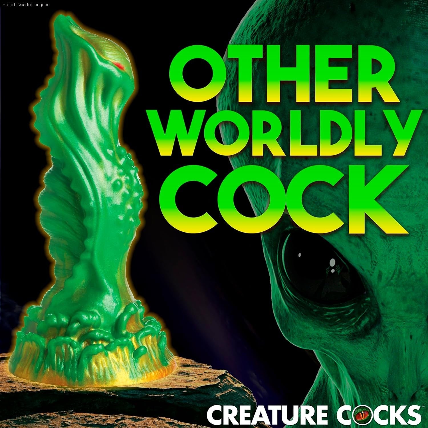 This cute Andromeda alien is the perfect size to crawl inside your most intimate of places! Green and gold skin shine when light hits it. Two narrow, red eyes watch you with a menacing glare. The head has small, soft ears, a narrow face and a bumpy, large chest that makes the dong swollen at the center. It is textured for your pleasure and will satisfy you in new ways that only this alien can deliver! Made out of premium, flexible, phthalate-free silicone, this dong is body-safe and best used with water-based lubricants only. Enjoy hands free rides due to the strong suction cup base! Invite a partner to indulge in kinky cosplay or fantasy roleplay and use their favorite harness to transform this dong into a strapon! Afterward, make sure to wash it with warm water and mild soap, then spray it with a toy cleaner and air-dry. Keep out of direct sunlight and heat.