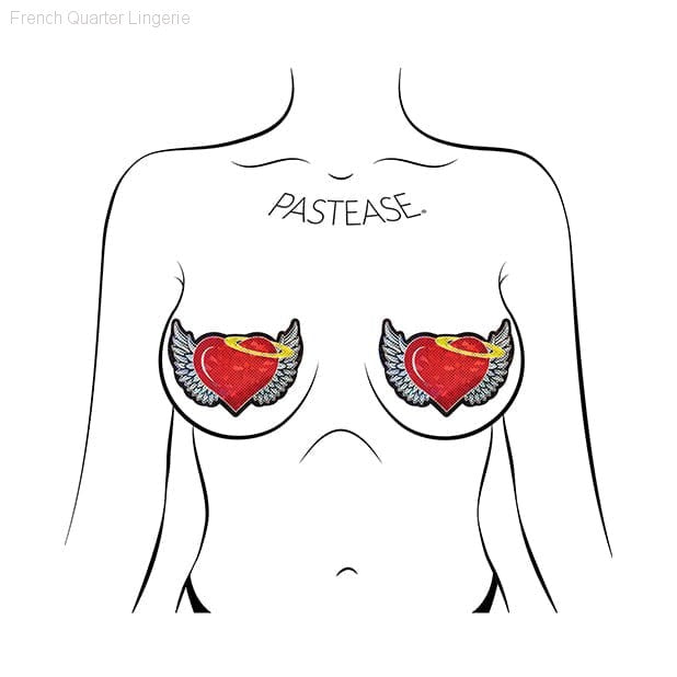 Angel Heart: Red Glitter Hearts with Wings & Gold Halo Nipple Pasties by Pastease® are hand-made in the USA of soft form-fitting glittery material that forms seamlessly to curves and resists wrinkling over hardening nipples.