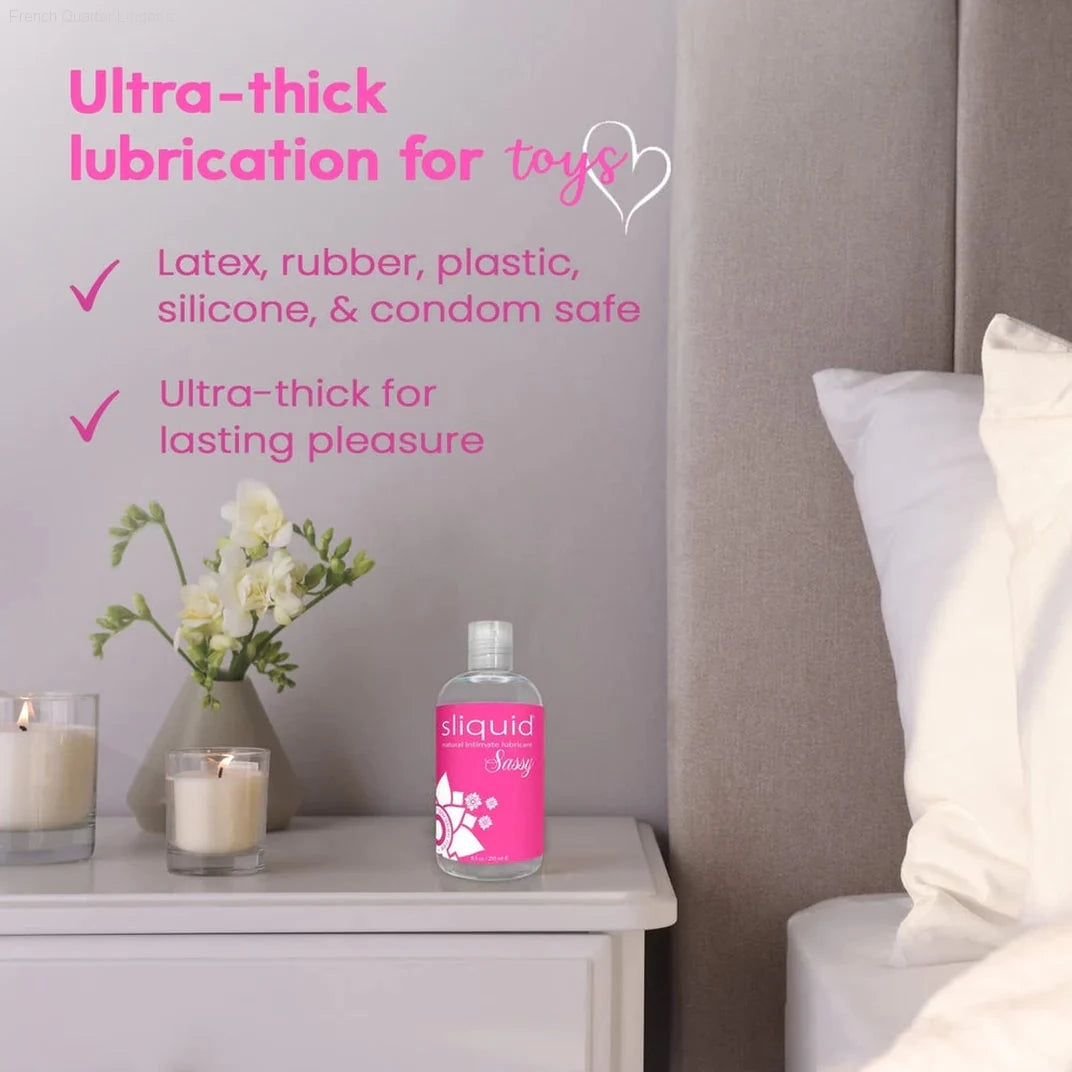 Sliquid Naturals Sassy is a water-based intimate lubricant offering a dense, gel-like consistency. Formulated with the same ingredients as Sliquid Naturals H2O, this lubricant contains a higher percentage of plant cellulose, creating a thicker viscosity to help reduce naturally occurring friction. Sliquid Sassy stays in place, is long-lasting, and creates a more enjoyable experience for both partners. Ideal for any type of intimacy, especially backdoor play, Sassy provides additional padding for greater comfort. This formula is safe to use with all toy materials and condoms. To ensure the safety of your customers, Sliquid Naturals Sassy does not include any desensitizing agents, which may lead to tissue damage.