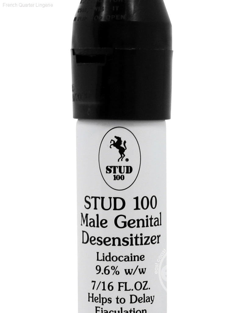 STUD 100 contains Lidocaine USP 9.6% w/w (approx. 10mg per metered dose) which acts as a topical desensitizer and does not require a prescription.