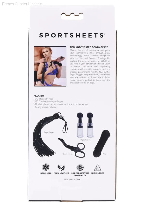 Master the art of dominance and guide your submissive partner through every exhilaratingly kinky scenario imaginable with the Tied and Twisted Bondage Kit. Explore the core principles of BDSM as you revel in your partners obedience. Learn to create seductive and captivating restraints with smooth, luxurious rope and practice punishments with the faux leather finger flogger. Keep their body sensitive to even the softest touch with the included nipple suckers, perfect to keep even the brattiest bottoms on edge.