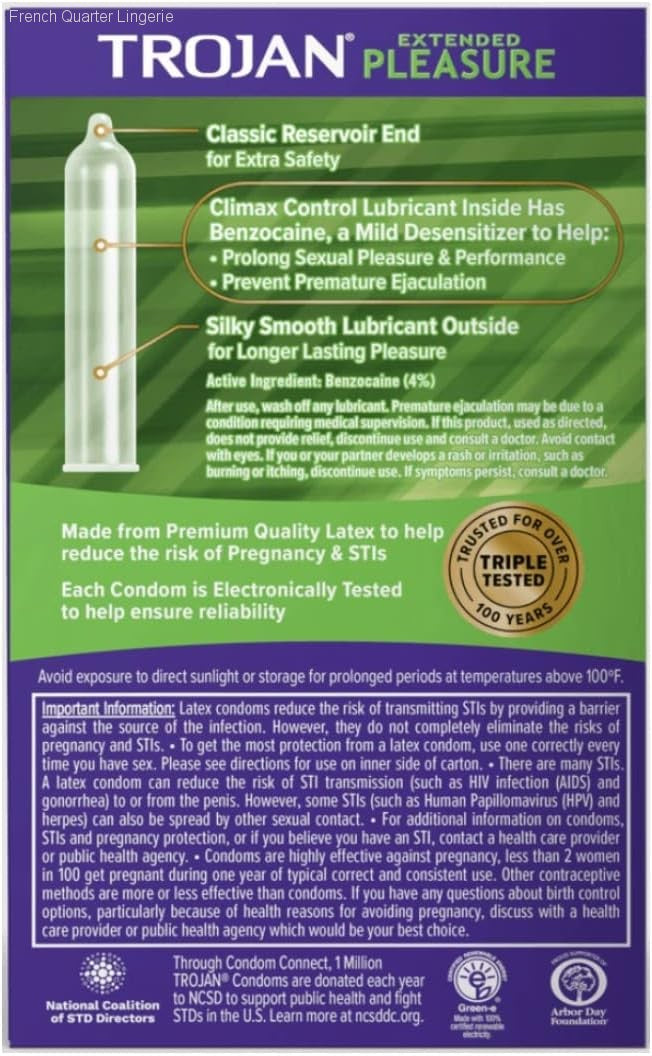 The night goes on and on and on. Trojan™ Extended Pleasure condoms come with Climax Control Lubricant to help keep you going while you’re going at it. The clear lube has a special active ingredient (Benzocaine, 4%: male genital desensitizer) to help prevent premature ejaculation and provide greater staying power. These condoms help you last longer so the pleasure does too.