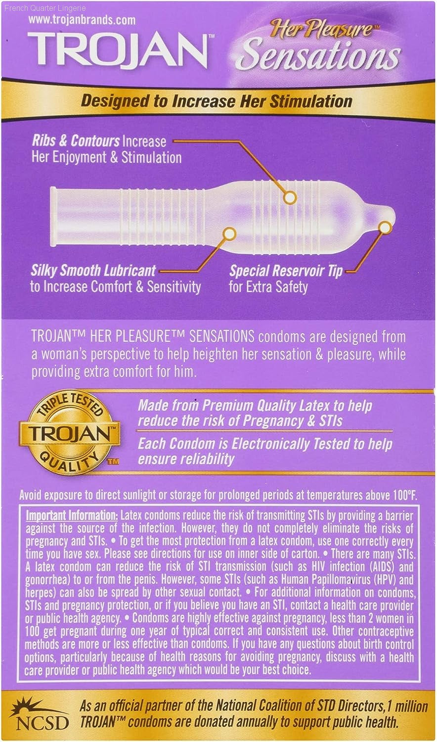 Trojan™ Her Pleasure condoms are designed with her body in mind. Women can enjoy the ribbed and contoured design that helps heighten her stimulation, while men can experience a comfortable, natural feel. She’ll be loving it, so he will too.