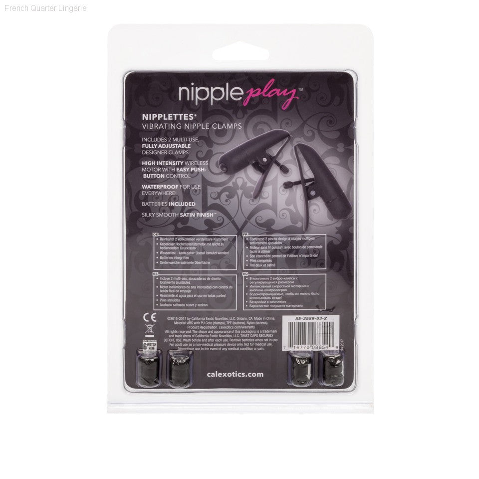 Engage in erotic nipple fun with the designer Nipple Play Nipplettes. The fully adjustable multi-use clamps are designed for intimate satisfaction and increased orgasmic ecstasy. The easy to use clamps are suitable for him and her, and ideal for first time and experienced pleasure/pain seekers.